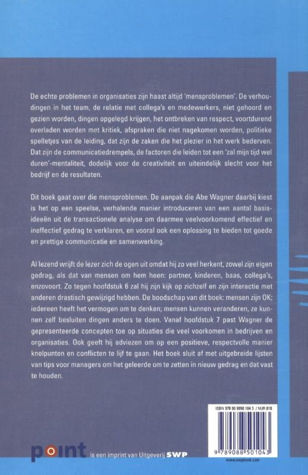 Dit boek gaat over die mensproblemen. De aanpak die Abe Wagner daarbij kiest is het op een speelse, verhalende manier introduceren van een aantal basisideeën uit de transactionele analyse om daarmee veelvoorkomend effectief en ineffectief gedrag te verklaren. En vooral ook een oplossing te bieden tot een goede en prettige communicatie en samenwerking.