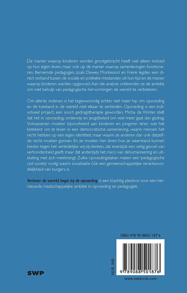 Er is een duidelijke relatie tussen opvoeding en de manier waarop het er in de wereld aan toe gaat. Als kinderen van jongs af aan meekrijgen dat het normaal is om er bij het minste of geringste op los te slaan, dan zullen ze als volwassenen hoogstwaarschijnlijk niet erg gediend zijn van het poldermodel. En wie opgroeit in een samenleving of buurt waarin het recht van de sterkste heerst, loopt een flinke kans om van zijn ouders te leren dat praten weinig helpt. Beroemde filosofen en pedagogen, zoals Kant, Dewey, Montessori en Freire legden een direct verband tussen de sociale en politieke misstanden uit hun tijd en de manier waarop kinderen werden grootgebracht. Aan die analyse ontleenden ze de ambitie om met behulp van pedagogische hervormingen de wereld te willen verbeteren. Om allerlei redenen is het tegenwoordig niet meer hip om opvoeding en de toestand in de wereld met elkaar in verband te zien. Opvoeding is nu een individueel project, een soort gedragstherapie. Maar is een kind eigenlijk wel goed opgevoed als hij niet crimineel is geworden? Of als zij niet ten prooi is gevallen aan een loverboy of breezersex? De stelling van dit boek is dat het in opvoeding, onderwijs en jeugdbeleid om veel meer zou moeten gaan dan gedrag. Bijvoorbeeld om het leren begrijpen en internaliseren van democratisch burgerschap, humaniteit en vrijheid. Wat betekent het om te leven in een democratische samenleving waarin je recht hebt op een eigen identiteit, maar waarin je dan ook anderen datzelfde recht moet gunnen? Hoe bied je weerstand tegen het verleidelijke wij-zij denken, dat enerzijds een veilig gevoel van verbondenheid geeft, maar anderzijds het risico van dehumaniseren en uitsluiten van de ander met zich meebrengt?