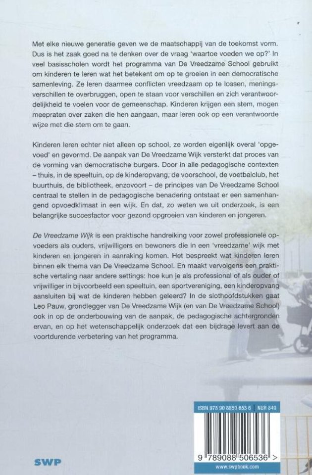 Het boek is een praktische handreiking voor zowel professionele opvoeders als ouders, vrijwilligers en bewoners die in een 'vreedzame' wijk met kinderen en jongeren in aanraking komen. Het bespreekt wat kinderen leren binnen elk thema van De Vreedzame School. En maakt vervolgens een praktische vertaling naar andere settings: hoe kun je als professional of als ouder of vrijwilliger in bijvoorbeeld een speeltuin, een sportvereniging, een kinderopvang aansluiten bij wat de kinderen hebben geleerd? In de slothoofdstukken gaat Leo Pauw, grondlegger van De Vreedzame Wijk (en van De Vreedzame School) ook in op de onderbouwing van de aanpak, de pedagogische achtergronden ervan, en op het wetenschappelijk onderzoek dat een bijdrage levert aan de voortdurende verbetering van het programma.