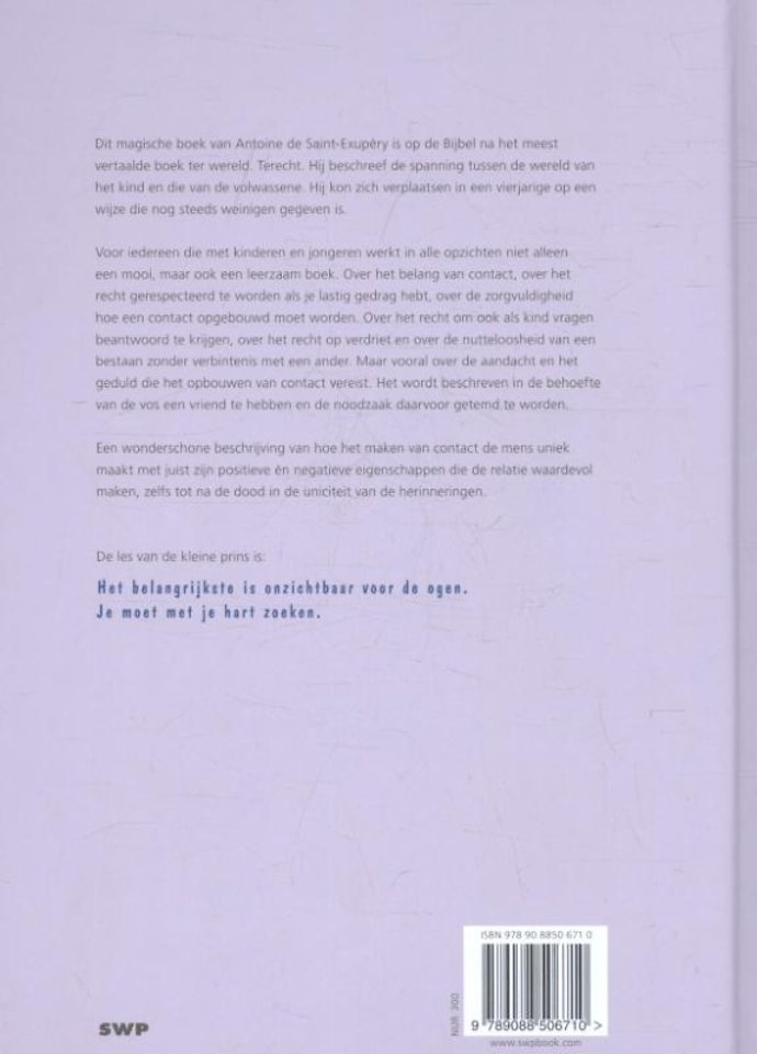 Het wordt beschreven in de behoefte van de vos een vriend te hebben en de noodzaak daarvoor getemd te worden. Een wonderschone beschrijving van hoe het maken van contact de mens uniek maakt met juist zijn positieve én negatieve eigenschappen die de relatie waardevol maken, zelfs tot na de dood in de uniciteit van de herinneringen.