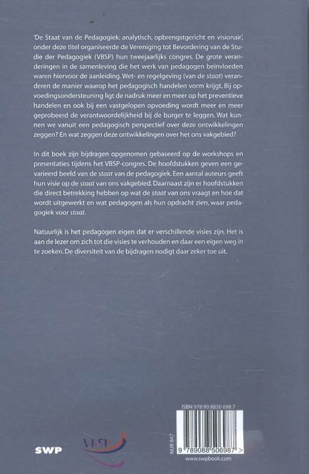Onze samenleving ondergaat grote veranderingen die het werk van de pedagoog direct en indirect beïnvloeden. Nieuwe wet- en regelgeving in de jeugdzorg en het onderwijs lijken de invulling van het pedagogisch beroep meer en meer te bepalen. Daarnaast vraagt de staat meer verantwoordelijkheid van de burgers zelf, ook bij de opvoeding van hun kinderen. Goede of slechte ontwikkelingen? Feit is dat de pedagoog zich tot deze ontwikkelingen dient te verhouden. Wat is de staat van de pedagogiek in deze? Is de pedagogiek meer en meer van de staat of kan de pedagoog de staat juist beïnvloeden door de bijdrage aan de opvoeding van de burgers van nu en de toekomst?