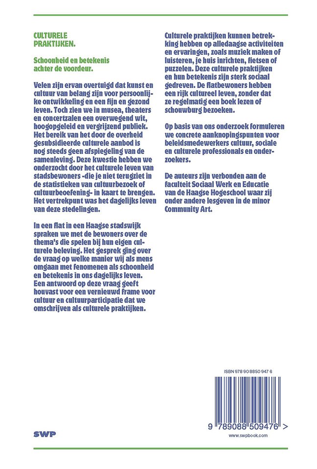 Culturele praktijken kunnen betrekking hebben op alledaagse activiteiten en ervaringen, zoals muziek maken of luisteren, je huis inrichten, fietsen of puzzelen. Deze culturele praktijken en hun betekenis zijn sterk sociaal gedreven. De flatbewoners hebben een rijk cultureel leven, zonder dat ze regelmatig een boek lezen of schouwburg bezoeken.