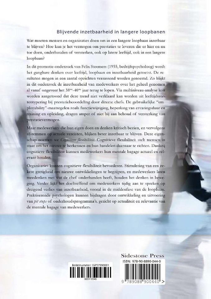 In dit promotie-onderzoek van Felix Steemers (1955, bedrijfspsycholoog) wordt het gangbare denken over leeftijd, loopbaan en inzetbaarheid getoetst. De resultaten mogen in een aantal opzichten verrassend worden genoemd. Zo blijkt in dit onderzoek de inzetbaarheid van medewerkers over het geheel genomen al vanaf ongeveer het 38ste-40ste jaar terug te lopen. Via multiniveau-analyse kon worden aangetoond dat deze trend niet verklaard kan worden uit leeftijdsstereotypering bij prestatiebeoordeling door directe chefs. De gebruikelijke “employability”-maatregelen zoals functiewijziging, beperking van ervaringsduur en training en opleiding, dragen amper of niet bij aan behoud of versterking van prestatievermogen.