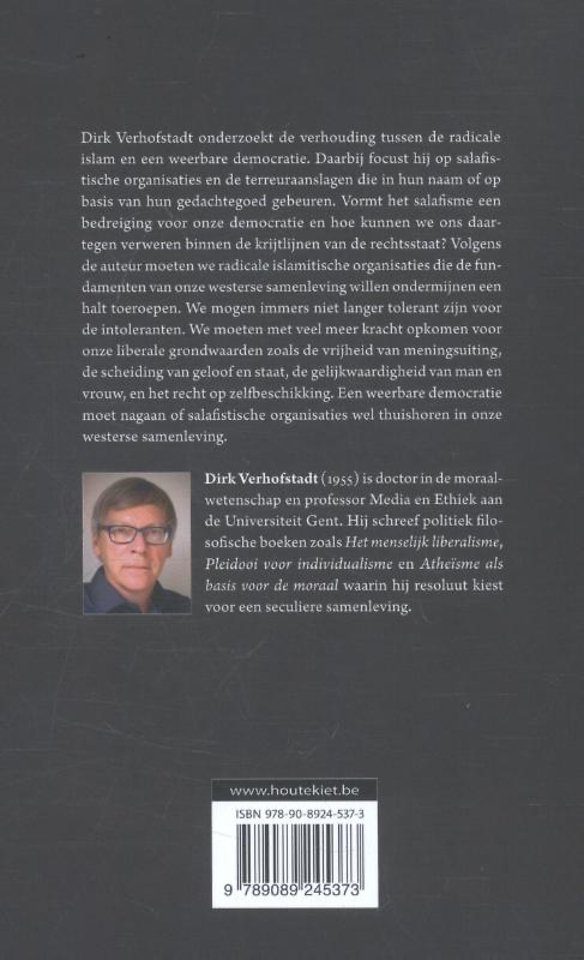 Dirk Verhofstadt onderzoekt de verhouding tussen de radicale islam en een weerbare democratie. Daarbij focust hij op salafistische organisaties en de terreuraanslagen die in hun naam of op basis van hun gedachtegoed gebeuren. Vormt het salafisme een bedreiging voor onze democratie en hoe kunnen we ons daartegen verweren binnen de krijtlijnen van de rechtsstaat? Volgens de auteur moeten we radicale islamitische organisaties die de fundamenten van onze westerse samenleving willen ondermijnen een halt toeroepen. We mogen immers niet langer tolerant zijn voor de intoleranten. We moeten met veel meer kracht opkomen voor onze liberale grondwaarden zoals de vrijheid van meningsuiting, de scheiding van geloof en staat, de gelijkwaardigheid van man en vrouw, en het recht op zelfbeschikking. Een weerbare democratie moet nagaan of salafistische organisaties wel thuishoren in onze westerse samenleving.