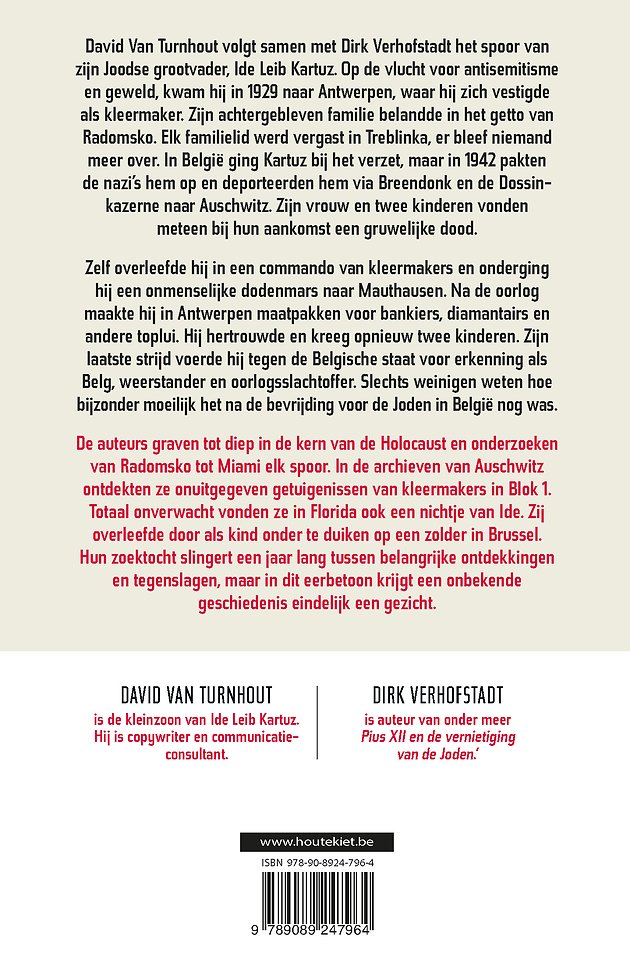 David Van Turnhout volgt samen met Dirk Verhofstadt het spoor van zijn Joodse grootvader, Ide Leib Kartuz. Op de vlucht voor antisemitisme en geweld, kwam hij in 1929 naar Antwerpen, waar hij zich vestigde als kleermaker. Zijn achtergebleven familie belandde in het getto van Radomsko. Elk familielid werd vergast in Treblinka, er bleef niemand meer over. In België ging Kartuz bij het verzet, maar in 1942 pakten de nazi’s hem op en deporteerden hem via Breendonk en de Dossinkazerne naar Auschwitz. Zijn vrouw en twee kinderen vonden meteen bij hun aankomst een gruwelijke dood.