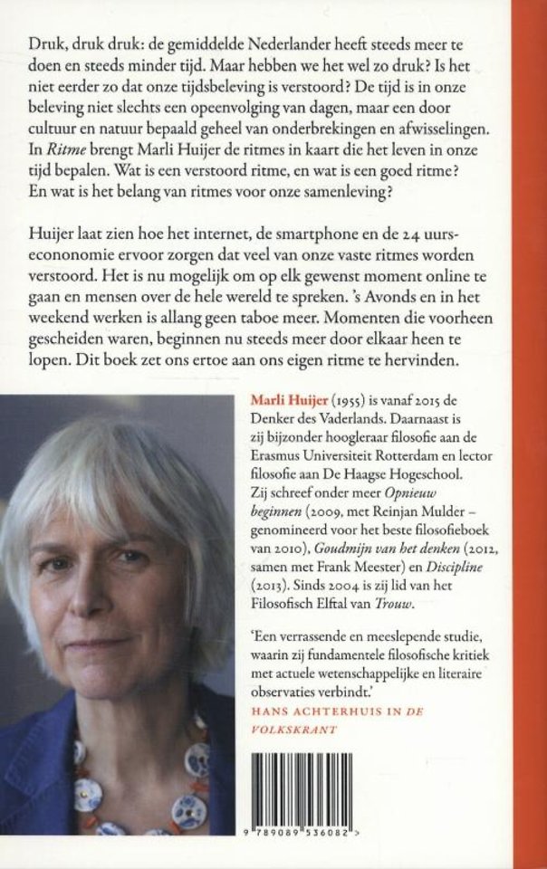 Druk, druk druk: de gemiddelde Nederlander heeft steeds meer te doen en steeds minder tijd. Maar hebben we het wel zo druk? Is het niet eerder zo dat onze tijdsbeleving is verstoord? De tijd is in onze beleving niet slechts een opeenvolging van dagen, maar een door cultuur en natuur bepaald geheel van onderbrekingen en afwisselingen. In Ritme brengt Marli Huijer de ritmes in kaart die het leven in onze tijd bepalen. Wat is een verstoord ritme, en wat is een goed ritme? En wat is het belang van ritmes voor onze samenleving? Huijer laat zien hoe het internet, de smartphone en de 24-uursecononomie ervoor zorgen dat veel van onze vaste ritmes worden verstoord. Het is nu mogelijk om op elk gewenst moment online te gaan en mensen over de hele wereld te spreken. 's Avonds en in het weekend werken is al lang geen taboe meer. Momenten die voorheen gescheiden waren, beginnen nu steeds meer door elkaar heen te lopen. Dit boek zet ons ertoe aan ons eigen ritme te hervinden. 'Een verrassende en meeslepende studie, waarin zij fundamentele filosofische kritiek met actuele wetenschappelijke en literaire observaties verbindt.' Hans Achterhuis in de Volkskrant Marli Huijer (1955) is vanaf 2015 de Denker des Vaderlands. Daarnaast is zij bijzonder hoogleraar filosofie aan de Erasmus Universiteit Rotterdam en lector filosofie aan De Haagse Hogeschool. Zij schreef onder meer Ritme, Goudmijn van het denken en Discipline. Sinds 2004 is zij lid van het Filosofisch Elftal van Trouw.