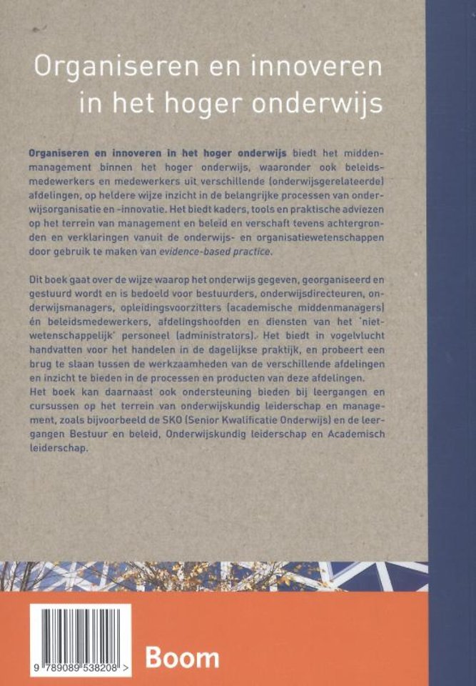 Organiseren en innoveren in het hoger onderwijs biedt het middenmanagement binnen het hoger onderwijs, waaronder ook beleidsmedewerkers en medewerkers uit verschillende (onderwijsgerelateerde) afdelingen, op heldere wijze inzicht in de belangrijke processen van onderwijsorganisatie en -innovatie. Het biedt kaders, tools en praktische adviezen op het terrein van management en beleid en verschaft tevens achtergronden en verklaringen vanuit de onderwijs- en organisatiewetenschappen door gebruik te maken van evidence-based practice.