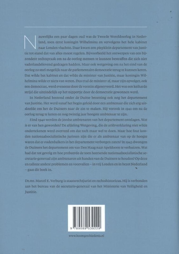 Hier werd alles in gereedheid gebracht voor de terugkeer naar de democratie na de bevrijding. Marcel Verburg beschrijft de schizofrenie van het justitiële beleid in de oorlogsjaren, maar ook de idealen en angsten van hen die er werkten. Ook de Jodenvervolging en de rol van Justitie daarin komen aan bod.