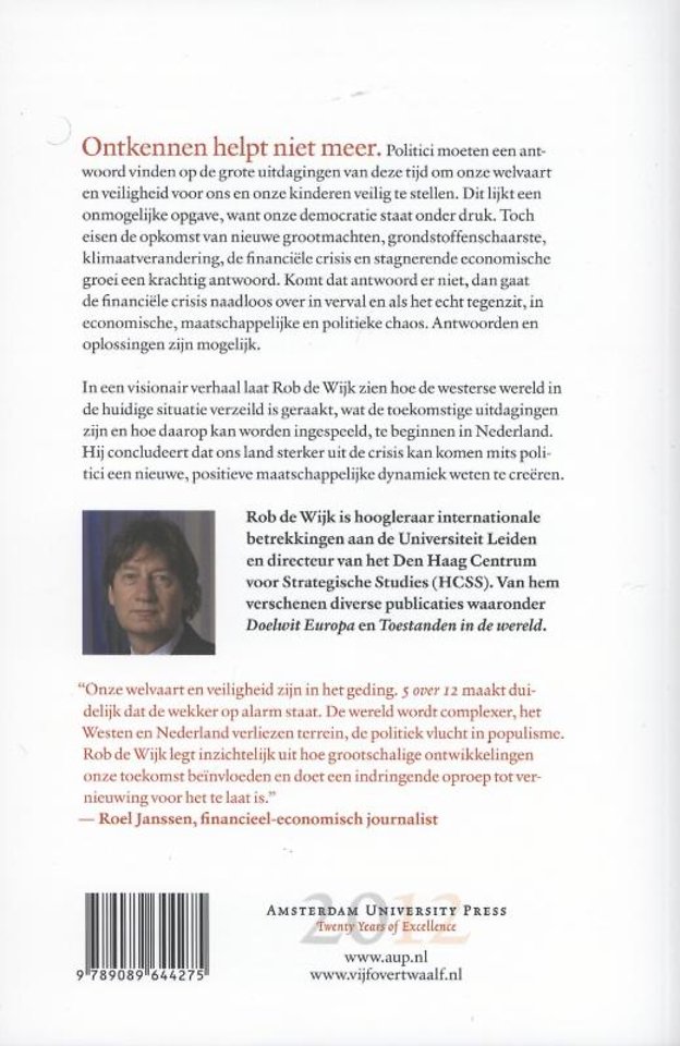 "Onze welvaart en veiligheid zijn in het geding. '5 over 12' maakt duidelijk dat de wekker op alarm staat. De wereld wordt complexer, het Westen en Nederland verliezen terrein, de politiek vlucht in populisme. Rob de Wijk legt inzichtelijk uit hoe grootschalige ontwikkelingen onze toekomst beïnvloeden en doet een indringende oproep tot vernieuwing voor het te laat is." - Roel Janssen, financieel-economisch journalist