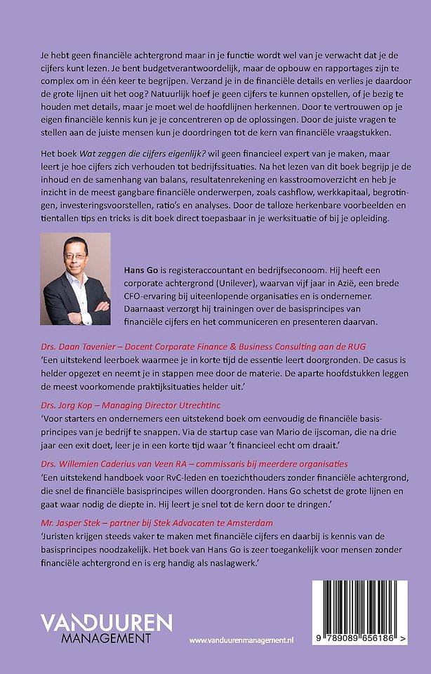 Juristen krijgen steeds vaker te maken met financiële cijfers en daarbij is kennis van de basisprincipes noodzakelijk. Het boek van Hans Go is zeer toegankelijk voor mensen zonder financiële achtergrond en is erg handig als naslagwerk. - Mr. Jasper Stek – partner bij Stek Advocaten te Amsterdam