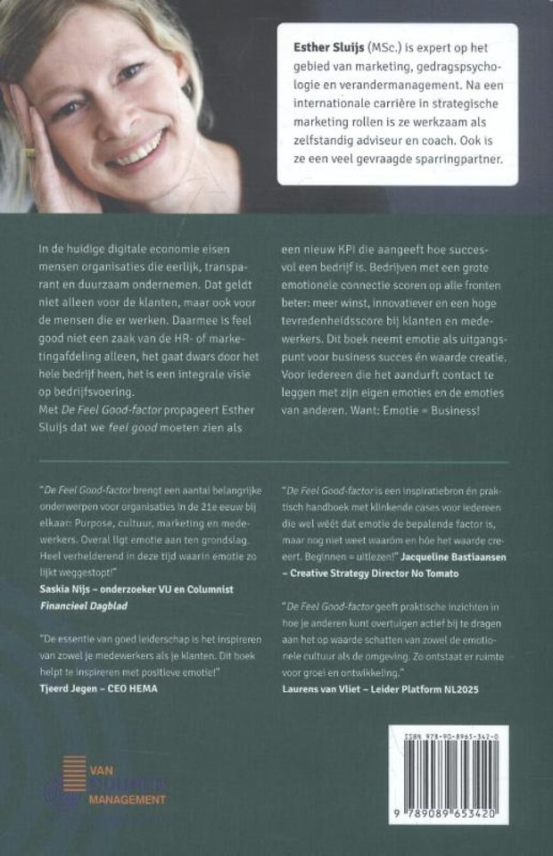 Met 'De Feel Good-factor' propageert Esther Sluijs dat we feel good moeten zien als een nieuw KPI die aangeeft hoe succesvol een bedrijf is. Bedrijven met een grote emotionele connectie scoren op alle fronten beter: meer winst, innovatiever en een hogere tevredenheidsscore bij klanten en medewerkers. Dit boek neemt emotie als uitgangspunt voor business succes én waarde creatie. Voor iedereen die het aandurft contact te leggen met zijn eigen emoties en de emoties van anderen. Want: Emotie = Business!