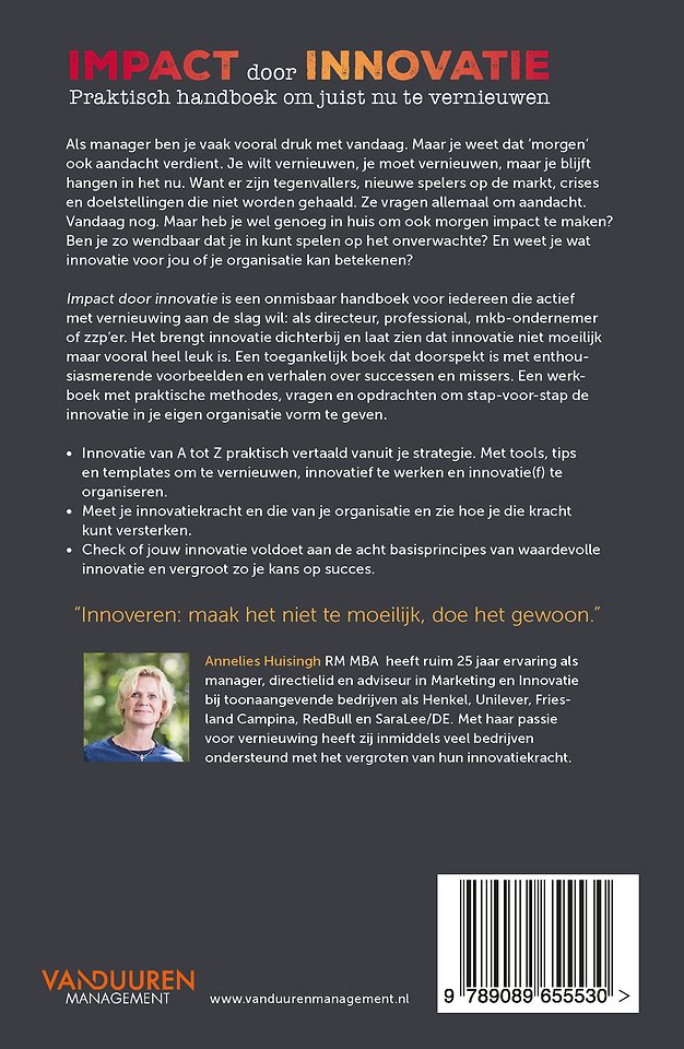 Annelies Huisingh RM MBA heeft ruim 25 jaar ervaring als manager, directielid en adviseur in Marketing en Innovatie bij toonaangevende bedrijven als Henkel, Unilever, FrieslandCampina, RedBull en SaraLee/DE. Met haar passie voor vernieuwing heeft zij inmiddels vele bedrijven ondersteund met het vergroten van hun innovatiekracht. Annelies is auteur van Impact door Innovatie.