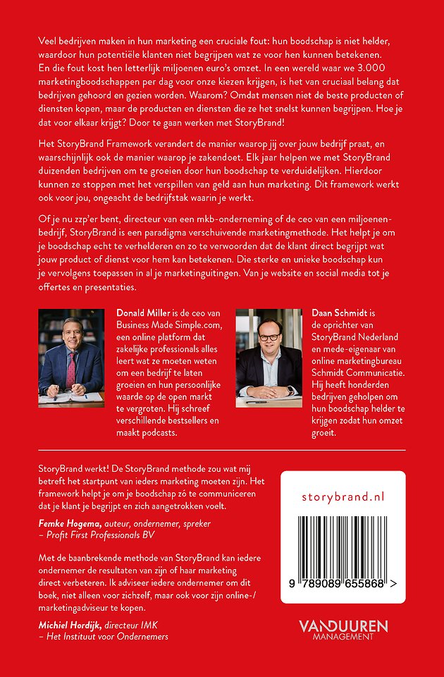Veel bedrijven verspillen jaarlijks kostbare budgetten aan marketing die niet werkt. Zonde van het geld. Maar waarom doen ze het dan? Omdat zij de kern van hun boodschap toevertrouwen aan reclamebureaus en grafisch vormgevers. Die weten alles van vormgeving en Photoshop, maar hebben nog nooit een boek gelezen over hoe je de boodschap van een bedrijf helder krijgt. Zo gaan ze helaas voorbij aan het belang van de klant. Die zit niet te wachten op social mediaberichten of een billboard langs de snelweg.