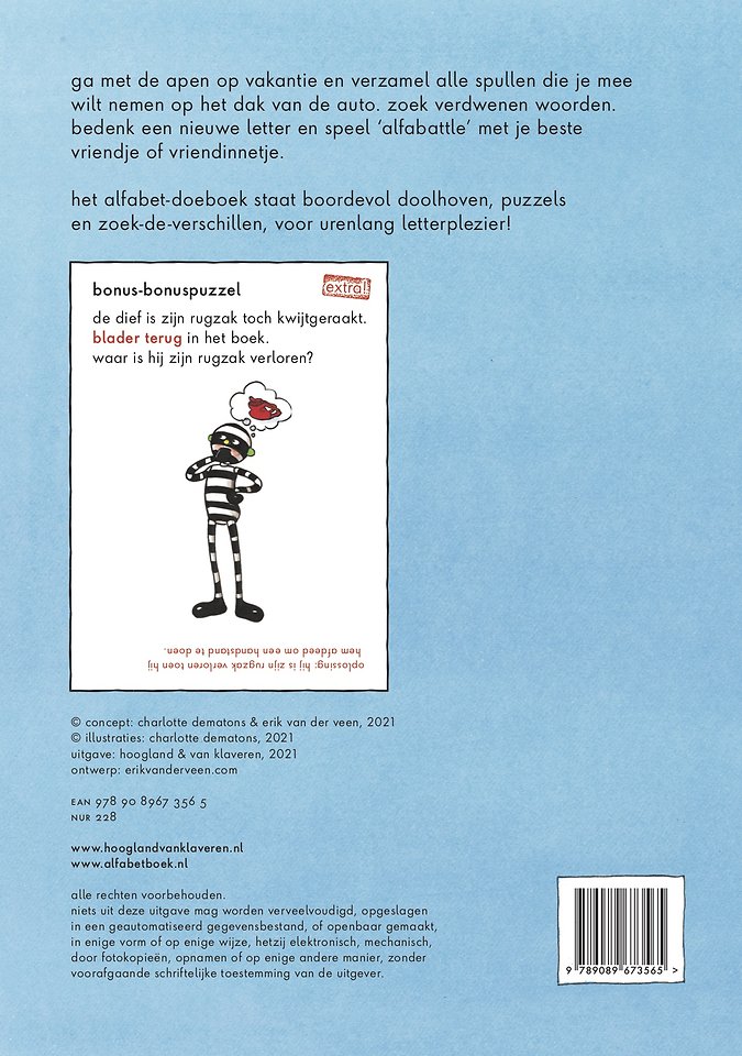 Ga met de apen op vakantie en verzamel alle spullen die je mee wilt nemen op het dak van de auto. Zoek verdwenen woorden. Bedenk een nieuwe letter en speel ‘alfabattle’ met je beste vriendje of vriendinnetje.