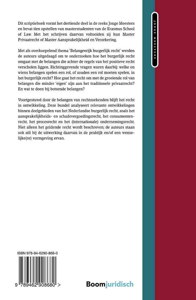 Dit scriptieboek vormt het dertiende deel in de reeks Jonge Meesters en bevat tien opstellen van masterstudenten van de Erasmus School of Law. Met het schrijven daarvan voltooiden zij hun Master Privaatrecht of Master Aansprakelijkheid en Verzekering.