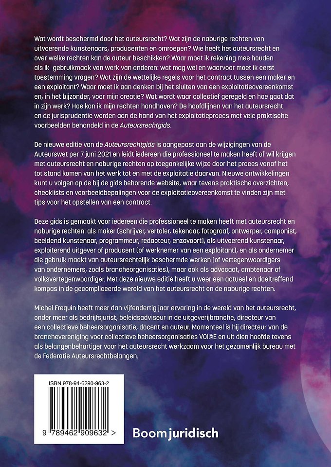 De nieuwe editie van de Auteursrechtgids voor de Nederlandse praktijk is aangepast aan de wijzigingen van de Auteurswet per 7 juni 2021 en leidt iedereen die professioneel te maken heeft of wil krijgen met auteursrecht en naburige rechten op toegankelijke wijze door het proces vanaf het tot stand komen van het werk tot en met de exploitatie daarvan. Nieuwe ontwikkelingen kunt u volgen op de bij de gids behorende website, waar tevens praktische overzichten, checklists en voorbeeldbepalingen voor de exploitatieovereenkomst te vinden zijn met tips voor het opstellen van een contract.