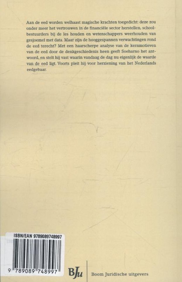 Met een haarscherpe analyse van de kernmotieven van de eed door de denkgeschiedenis heen geeft Soeharno het antwoord, en stelt hij vast waarin vandaag de dag nu eigenlijk de waarde van de eed ligt. Voorts pleit hij voor herziening van het Nederlandse eedgebaar.