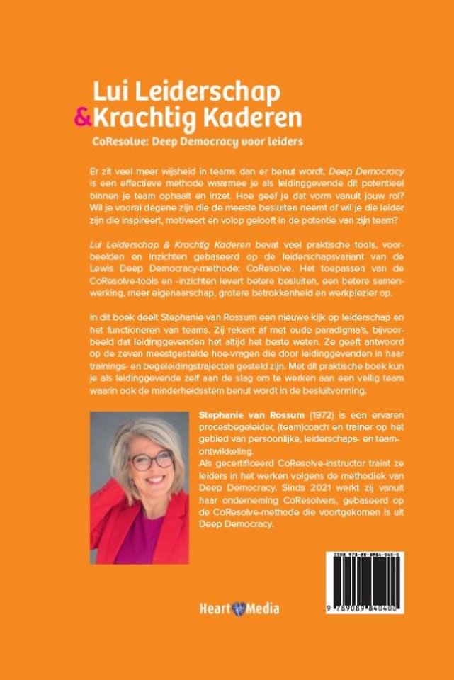 In dit boek deelt Stephanie van Rossum een nieuwe kijk op leiderschap en het functioneren van teams. Zij rekent af met oude paradigma’s, bijvoorbeeld dat leidinggevenden het altijd het beste weten. Ze geeft antwoord op de zeven meestgestelde hoe-vragen die door leidinggevenden in haar trainings- en begeleidingstrajecten gesteld zijn. Met dit praktische boek kun je als leidinggevende zelf aan de slag om te werken aan een veilig team waarin ook de minderheidsstem benut wordt in de besluitvorming.