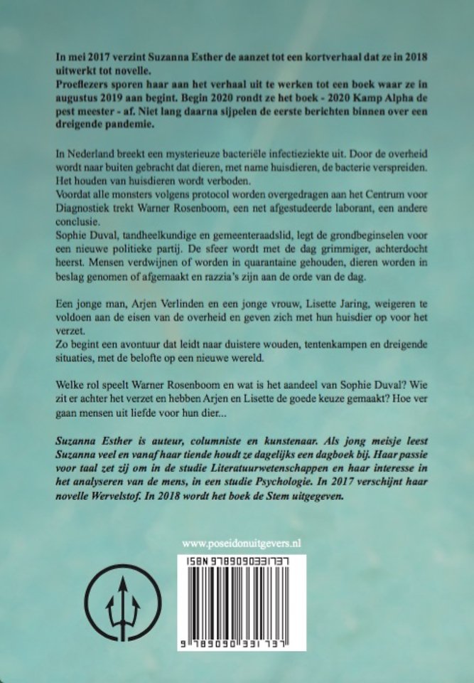 In mei 2017 verzint Suzanna Esther de aanzet tot een kortverhaal dat ze in 2018 uitwerkt tot novelle. Proeflezers sporen haar aan het verhaal uit te werken tot een boek waar ze augustus 2019 aan begint. Begin 2020 rondt ze het boek, 2020 Kamp Alpha de pest meester, af. Niet lang daarna sijpelen de eerste berichten binnen over een dreigende pandemie.