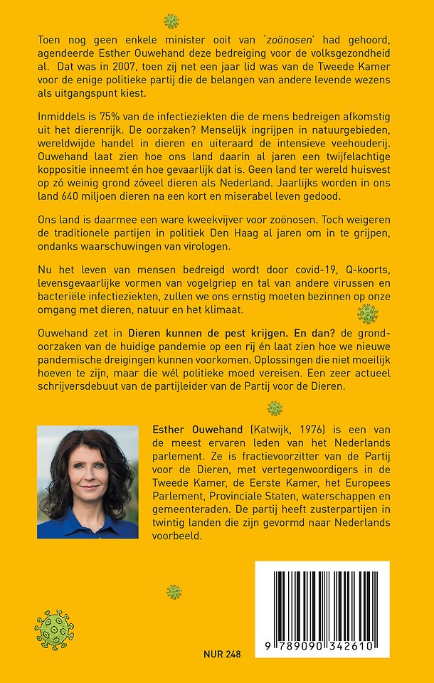 Ouwehand zet in Dieren kunnen de pest krijgen. En dan? de grondoorzaken van de huidige pandemie op een rij én laat zien hoe we nieuwe pandemische dreigingen kunnen voorkomen. Oplossingen die niet moeilijk hoeven te zijn, maar die wél politieke moed vereisen. Een zeer actueel schrijversdebuut van de partijleider van de Partij voor de Dieren.