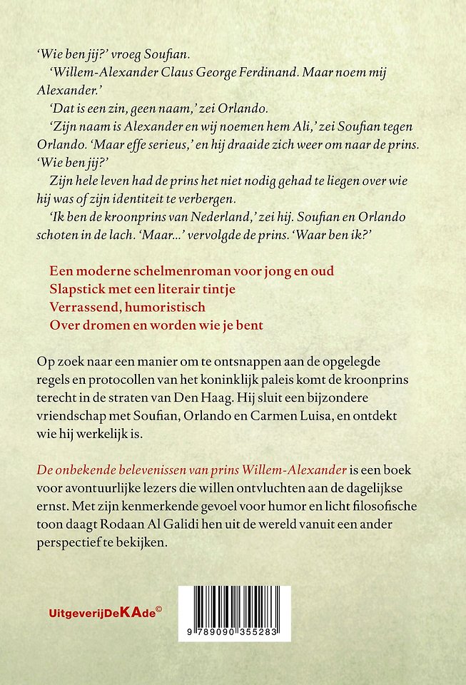 De onbekende belevenissen van prins Willem-Alexander is een boek voor avontuurlijke lezers die willen ontvluchten aan de dagelijkse ernst. Met zijn kenmerkende gevoel voor humor daagt Rodaan Al Galidi hen uit de wereld vanuit een ander perspectief te bekijken.