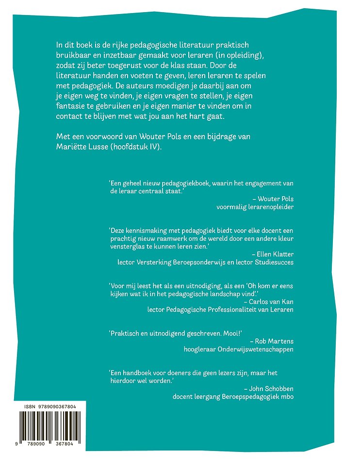 In dit boek is de rijke pedagogische literatuur praktisch bruikbaar en inzetbaar gemaakt voor leraren (in opleiding), zodat zij beter toegerust voor de klas staan. Door de literatuur handen en voeten te geven, leren leraren te spelen met de pedagogiek. De auteurs moedigen je daarbij aan om je eigen weg te vinden, je eigen vragen te stellen, je eigen fantasie te gebruiken en je eigen manier te vinden om in contact te blijven met wat jou aan het hart gaat.