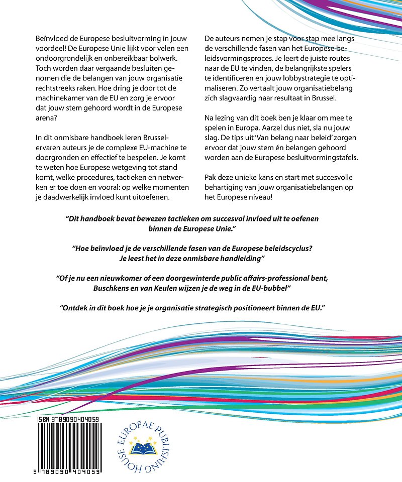 Na lezing van dit boek ben je klaar om mee te spelen in Europa. Aarzel dus niet, sla nu jouw slag. De tips uit ‘Van belang naar beleid’ zorgen ervoor dat jouw stem én belangen gehoord worden aan de Europese besluitvormingstafels.