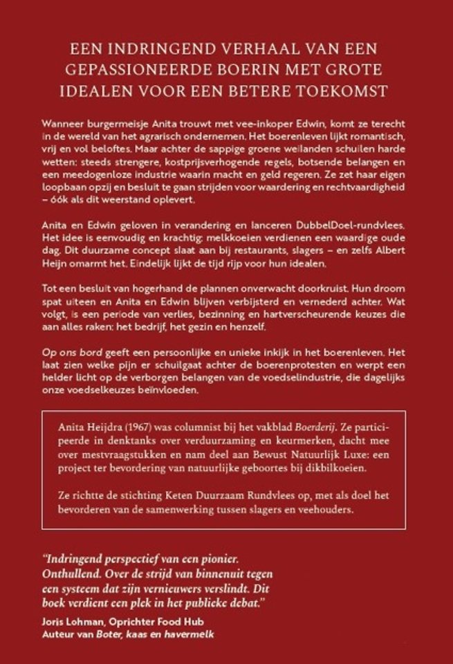 'Wat Op ons bord bijzonder maakt, is dat Anita Heijdra niet schrijft vanuit nostalgie, maar als pionier. Haar man Edwin en zij hebben altijd tegen de stroom in durven te roeien. Juist dát maakt het zo moeilijk dat je als pionier alsnog kunt stranden op precies dezelfde systeemfouten waar de hele agrarische sector onder lijdt. Dit boek verdient een plek in het publieke debat.'