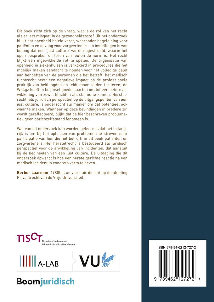 Dit boek richt zich op de vraag: wat is de rol van het recht als er iets misgaat in de gezondheidszorg? Uit het onderzoek blijkt dat openheid beleid vergt, waaronder begeleiding voor patiënten en opvang voor zorgverleners. In instellingen is van belang dat een ‘just culture’ wordt nagestreefd, waarin het open bespreken en leren van fouten de norm is. Het recht blijkt een ingewikkelde rol te spelen.