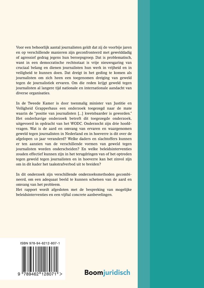In de Tweede Kamer is door toenmalig minister van Justitie en Veiligheid Grapperhaus een onderzoek toegezegd naar de mate waarin de “positie van journalisten [...] kwetsbaarder is geworden.” Het onderhavige onderzoek betreft dit toegezegde onderzoek, uitgevoerd in opdracht van het WODC. Onderzocht zijn drie hoofdvragen. Wat is de aard en omvang van ervaren en waargenomen geweld tegen journalisten in Nederland en in hoeverre is dit over de afgelopen 10 jaar veranderd? Welke daders en slachtoffers kunnen er ten aanzien van de verschillende vormen van geweld tegen journalisten worden onderscheiden? En welke beleidsinterventies zouden effectief kunnen zijn in het terugdringen van of het optreden tegen geweld tegen journalisten en in hoeverre kan het zinvol zijn om in dit kader het taakstrafverbod uit te breiden?