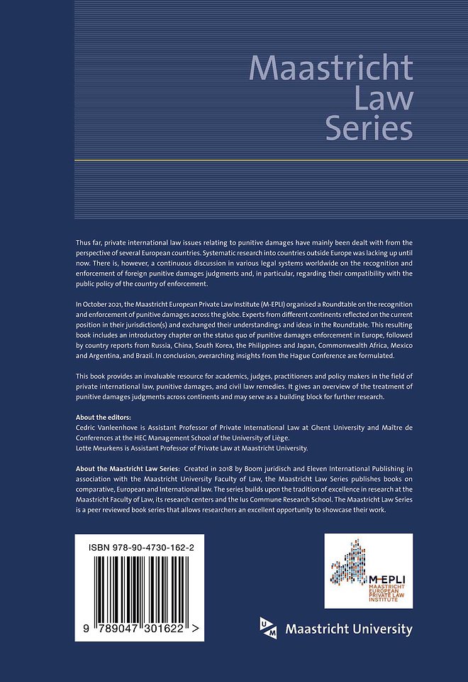 This resulting book includes an introductory chapter on the status quo of punitive damages enforcement in Europe, followed by country reports from Russia, China, South Korea, the Philippines and Japan, Commonwealth Africa, Mexico and Argentina, and Brazil. In conclusion, overarching insights from the Hague Conference are formulated. This book provides an invaluable resource for academics, judges, practitioners and policy makers in the field of private international law, punitive damages, and civil law remedies. It gives an overview of the treatment of punitive damages judgments across continents and may serve as a building block for further research.