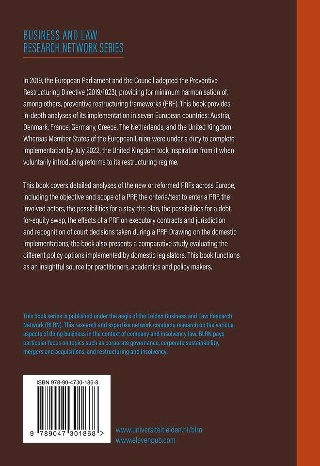 In 2019, the European Parliament and the Council adopted the Preventive Restructuring Directive (2019/1023), providing for minimum harmonisation of, among others, preventive restructuring frameworks (PRF). This book provides in-depth analyses of its implementation in seven European countries: Austria, Denmark, France, Germany, Greece, The Netherlands, and the United Kingdom. Whereas Member States of the European Union were under a duty to complete implementation by July 2022, the United Kingdom took inspiration from it when voluntarily introducing reforms to its restructuring regime.