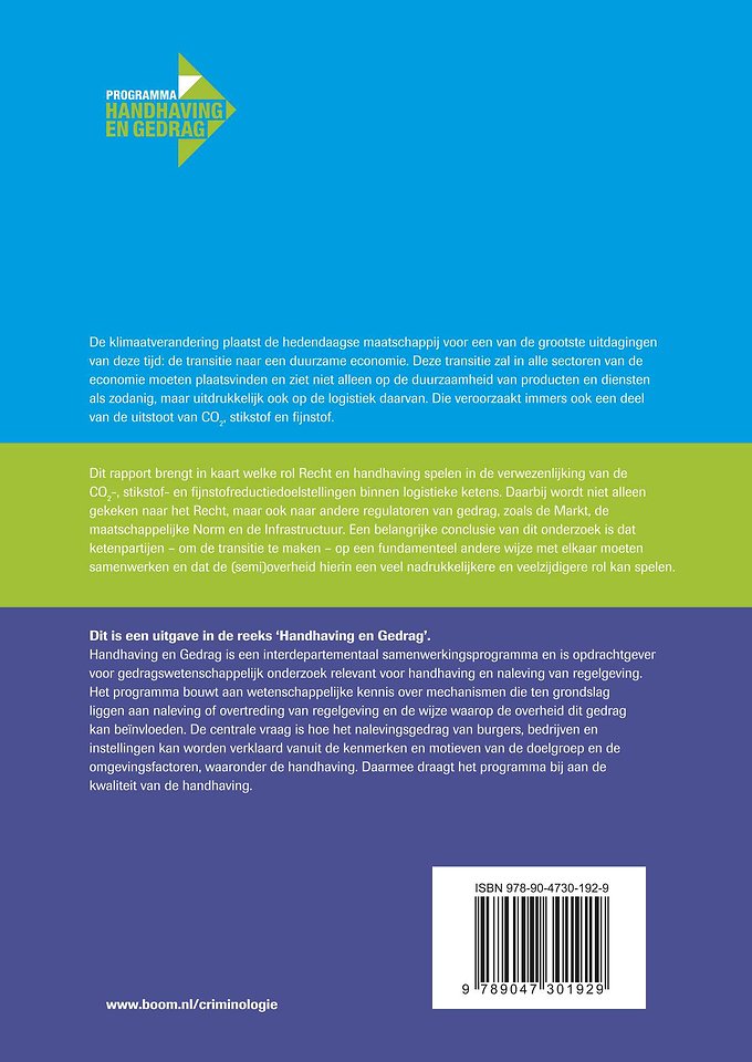 duurzaamheid logistieke ketens handhaving wetgeving supply chain management co2-reductie klimaatverandering samenwerking overheid milieu ketenpartijen transitie beleid naleving gedrag fijnstof stikstof europees recht regulatie markt norm infrastructuur bestuursrecht organisatie compliance transport