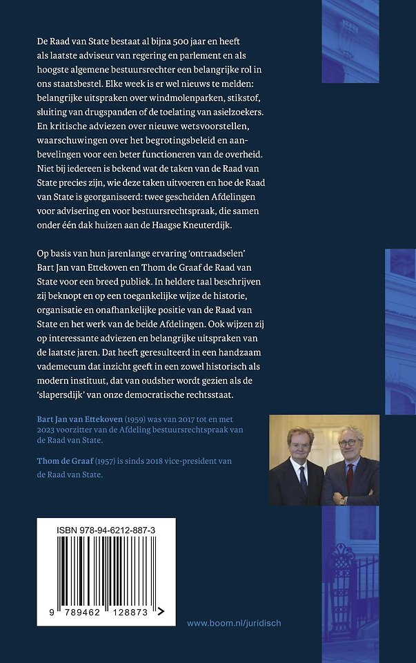 Op basis van hun jarenlange ervaring ‘ontraadselen’ Bart Jan van Ettekoven en Thom de Graaf de Raad van State voor een breed publiek. In heldere taal beschrijven zij beknopt en op een toegankelijke wijze de historie, organisatie en onafhankelijke positie van de Raad van State en het werk van de beide Afdelingen. Ook wijzen zij op interessante adviezen en belangrijke uitspraken van de laatste jaren. Dat heeft geresulteerd in een handzaam vademecum dat inzicht geeft in een zowel historisch als modern instituut, dat van oudsher wordt gezien als de ‘slapersdijk’ van onze democratische rechtsstaat.