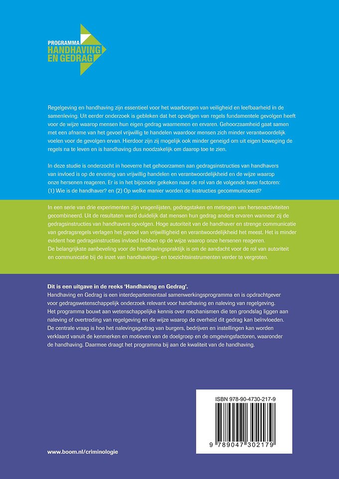 In een serie van drie experimenten zijn vragenlijsten, gedragstaken en metingen van hersenactiviteiten gecombineerd. Uit de resultaten werd duidelijk dat mensen hun gedrag anders ervaren wanneer zij de gedragsinstructies van handhavers opvolgen. Hoge autoriteit van de handhaver en strenge communicatie van gedragsregels verlagen het gevoel van vrijwilligheid en verantwoordelijkheid het meest. Het is minder evident hoe gedragsinstructies invloed hebben op de wijze waarop onze hersenen reageren. De belangrijkste aanbeveling voor de handhavingspraktijk is om de aandacht voor de rol van autoriteit en communicatie bij de inzet van handhavings- en toezichtsinstrumenten verder te vergroten.