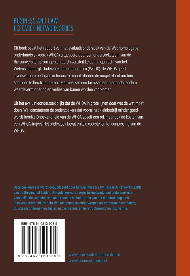 Dit boek bevat het rapport van het evaluatieonderzoek van de Wet homologatie onderhands akkoord (WHOA) uitgevoerd door een onderzoeksteam van de Rijksuniversiteit Groningen en de Universiteit Leiden in opdracht van het Wetenschappelijk Onderzoek- en Datacentrum (WODC). De WHOA geeft levensvatbare bedrijven in financiële moeilijkheden de mogelijkheid om hun schulden te herstructureren. Daarmee kan een faillissement met onder andere waardevermindering en verlies van banen worden voorkomen.