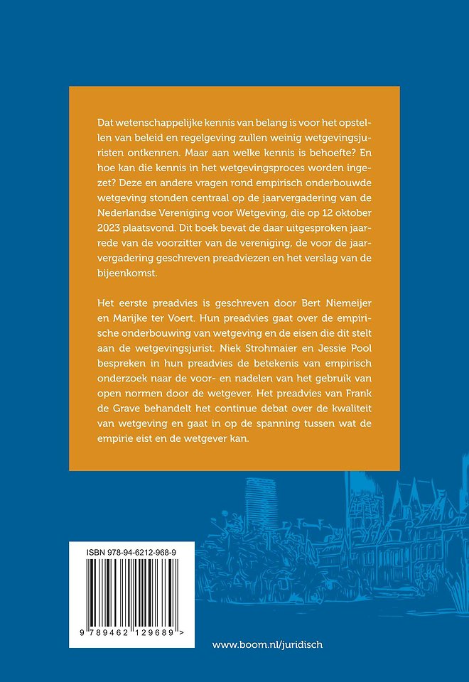 Dit boek bevat de daar uitgesproken jaarrede van de voorzitter van de vereniging, de voor de jaarvergadering geschreven preadviezen en het verslag van de bijeenkomst. Het eerste preadvies is geschreven door Bert Niemeijer en Marijke ter Voert. Hun preadvies gaat over de empirische onderbouwing van wetgeving en de eisen die dit stelt aan de wetgevingsjurist. Niek Strohmaier en Jessie Pool bespreken in hun preadvies de betekenis van empirisch onderzoek naar de voor- en nadelen van het gebruik van open normen door de wetgever. Het preadvies van Frank de Grave behandelt het continue debat over de kwaliteit van wetgeving en gaat in op de spanning tussen wat de empirie eist en de wetgever kan.