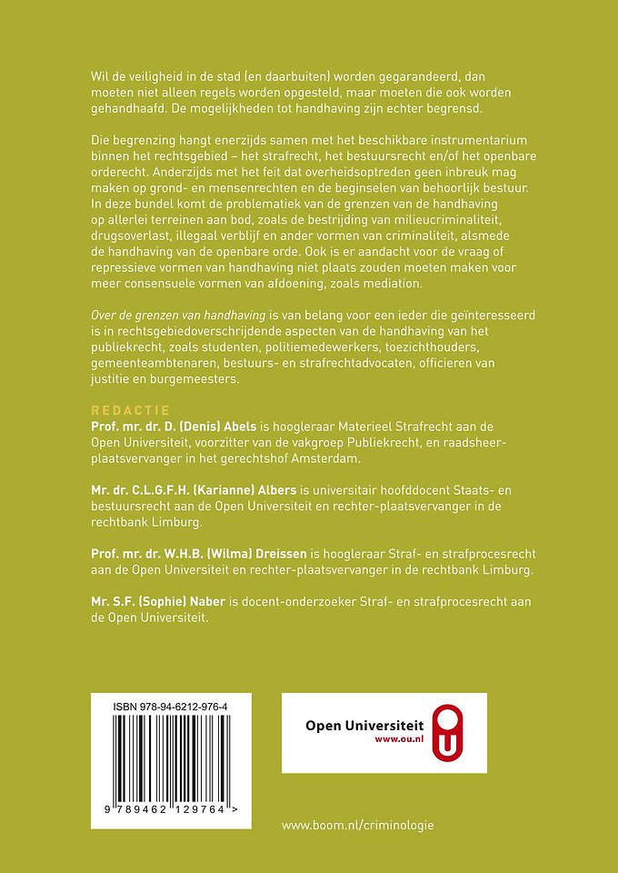 handhaving strafrecht bestuursrecht drugsafval rechtsgrenzen openbare orde milieucriminaliteit grondrechten wetgeving publiekrecht grond- en mensenrechten evenredigheid wet damocles seksuele intimidatie europees recht drugsbeleid vreemdelingenrecht criminaliteit big data digitale handhaving femicide toezicht terrorisme subsidiariteit rechtsstaat sanctionering mediation burgeronderzoek samenloop rechtspraak
