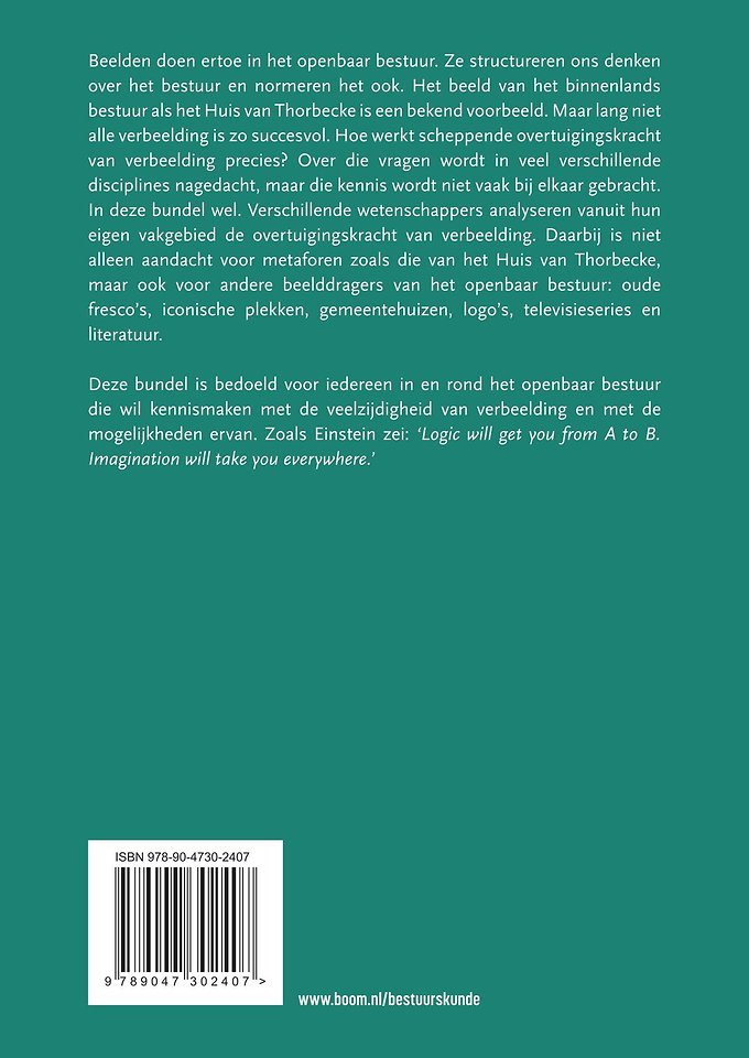 Daarbij is niet alleen aandacht voor metaforen zoals die van het Huis van Thorbecke, maar ook voor andere beelddragers van het openbaar bestuur: oude fresco’s, iconische plekken, gemeentehuizen, logo’s, televisieseries en literatuur. Deze bundel is bedoeld voor iedereen in en rond het openbaar bestuur die wil kennismaken met de veelzijdigheid van verbeelding en met de mogelijkheden ervan. Zoals Einstein zei: ‘Logic will get you from A to B. Imagination will take you everywhere.’