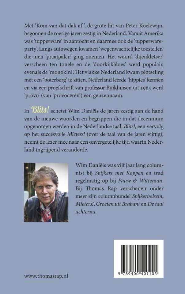 In Blits! schetst Wim Daniëls de jaren zestig aan de hand van de nieuwe woorden en begrippen die in dat decennium opgenomen werden in de Nederlandse taal. Blits!, een vervolg op het succesvolle Mieters! (over de taal van de jaren vijftig), neemt de lezer mee naar een onvergetelijke tijd waarin Nederland ingrijpend veranderde.