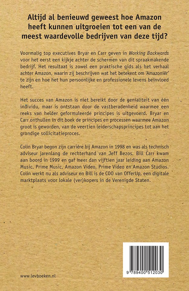 Altijd al benieuwd geweest hoe Amazon heeft kunnen uitgroeien tot een van de meest waardevolle bedrijven van deze tijd? Voormalig top executives Bryar en Carr geven in Working Backwards voor het eerst een kijkje achter de schermen van dit spraakmakende bedrijf. Het resultaat is zowel een praktische gids als het verhaal achter Amazon, waarin zij beschrijven wat het betekent om 'Amazoniaan' te zijn en hoe het hun persoonlijke en professionele levens beïnvloed heeft.