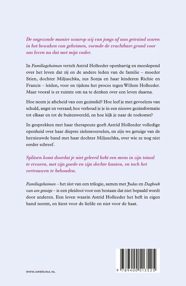In Familiegeheimen vertelt Astrid Holleeder openhartig en meeslepend over het leven dat zij en de andere leden van de familie - moeder Stien, dochter Miljuschka, zus Sonja en haar kinderen Richie en Francis - leiden, voor en tijdens het proces tegen Willem Holleeder. Maar vooral is er ruimte om na te denken over een leven daarna.