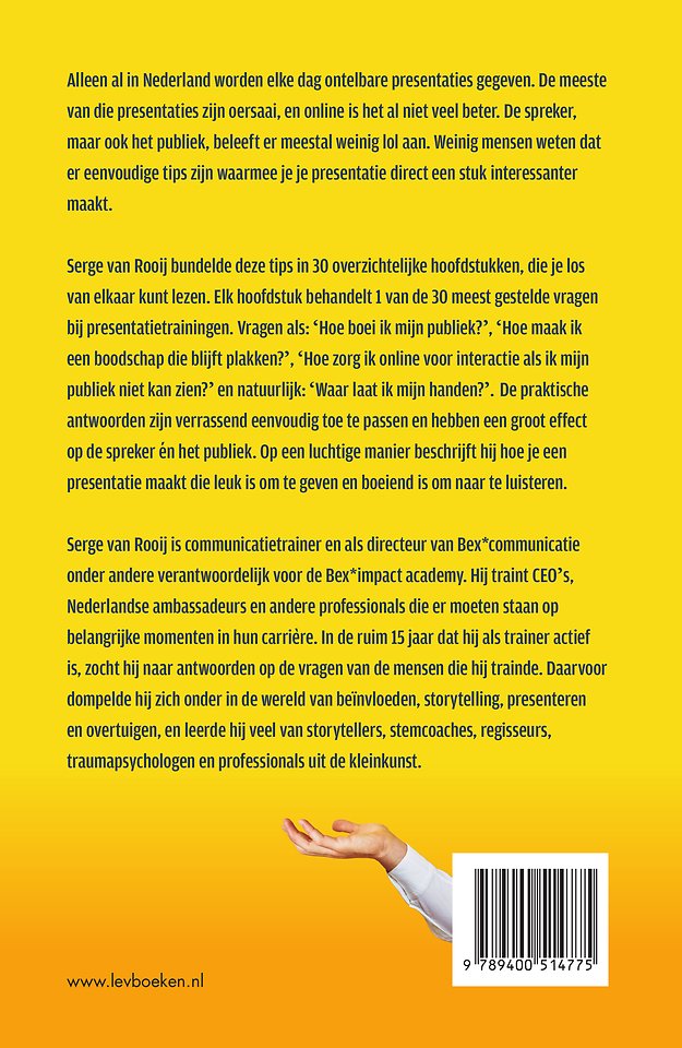 Serge van Rooij geeft antwoord op de 25 meest gestelde vragen bij presentatie-trainingen. Vragen als: ‘Hoe maak ik een boodschap die blijft plakken?’, ‘Ben ik nog wel authentiek als ik oefen?’, ‘Hoe kan ik zorgen voor meer interactie met mijn publiek?’ en natuurlijk ‘Waar laat ik mijn handen?’. De praktische antwoorden zijn verrassend eenvoudig toe te passen en hebben een groot effect op de spreker én het publiek. Op een luchtige manier beschrijft hij hoe je een presentatie maakt die leuk is om te geven en boeiend is om naar te luisteren.