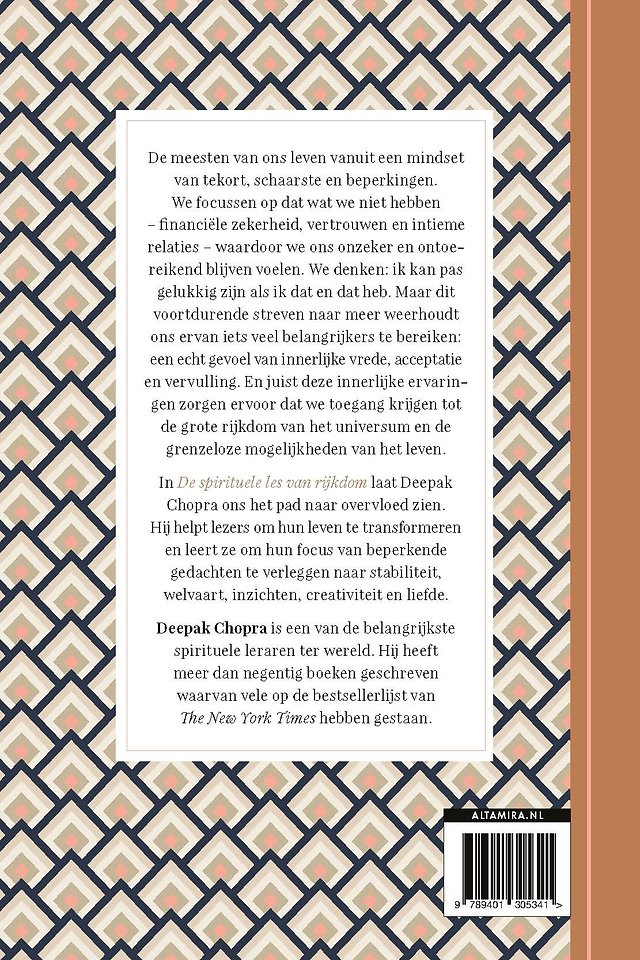 In 'De spirituele les van rijkdom' laat Deepak Chopra ons het pad naar overvloed zien. Waar hij in 'De 7 spirituele wetten van succes' lezers liet kennismaken met het spirituele pad naar succes, laat Chopra lezers in dit boek kennismaken met de weg naar innerlijke vrede en vervulling. Hij helpt hen om hun leven te transformeren door de focus te leggen op alle mogelijkheden in het leven. Volgens Chopra leven wij vanuit een mindset van tekort en beperkingen. We focussen niet op wat we hebben, zoals welvaart en stabiliteit, maar op wat we níét hebben. 'De spirituele les van rijkdom' leert ons dat dat innerlijke ervaringen de sleutel zijn tot de grote rijkdom van het universum en de grenzeloze mogelijkheden van het leven.
