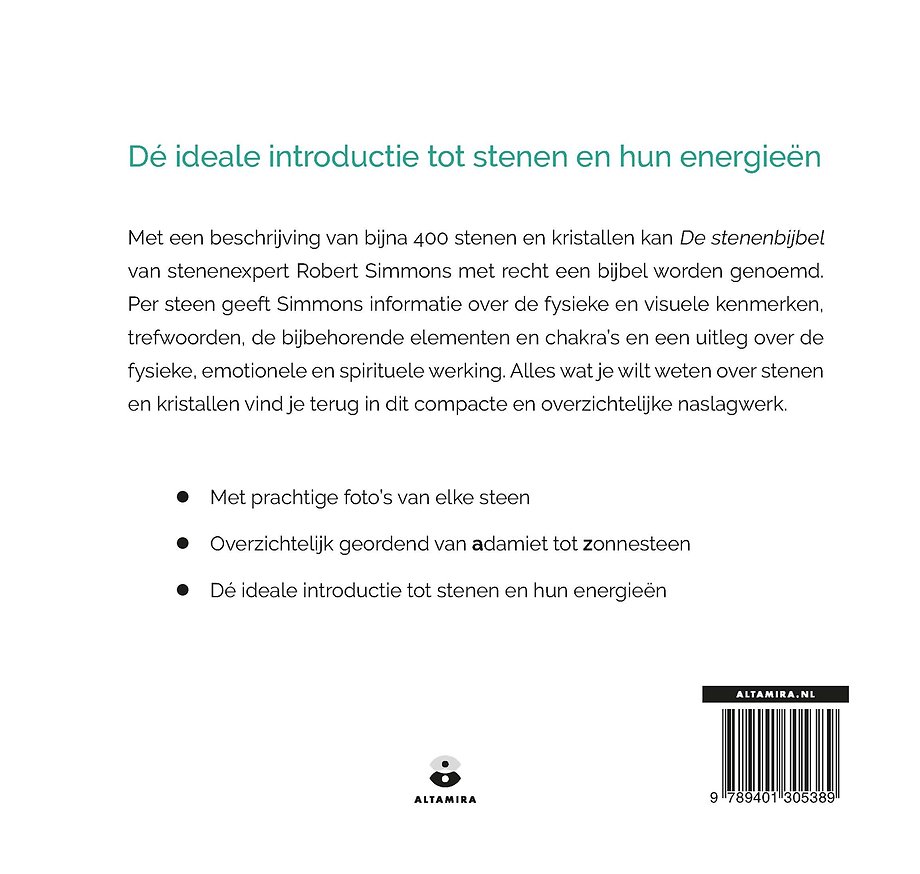 Leer alle stenen ter wereld kennen met 'De stenenbijbel' van Robert Simmons. In dit ultieme naslagwerk staan beschrijvingen van bijna 400 stenen, kristallen en mineralen. Per steen geeft Simmons informatie over de fysieke en visuele kenmerken, de bijbehorende elementen én chakra's. Daarnaast ontdek je welke spirituele, fysieke en emotionele werking de stenen teweeg brengen. Elke steen is voorzien van een foto. In 'De stenenbijbel' vind je alles wat je maar wilt weten over stenen en kristallen. Dit naslagwerk is daarom perfect voor iedere stenenliefhebber en stenenverzamelaar.