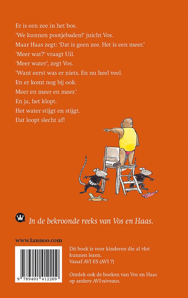 Perfecte mix van tekst en beeld op maat van beginnende lezers. Er is een zee in het bos. 'We kunnen pootjebaden!' juicht Vos. Maar Haas zegt: 'Dat is geen zee. Het is een meer.' 'Meer wat?' vraagt Uil. 'Meer water', zegt Vos. 'Want eerst was er niets. En nu heel veel. En er komt nog bij ook. Meer en meer en meer.' En ja, het klopt. Het water stijgt en stijgt. Dat loopt slecht af!