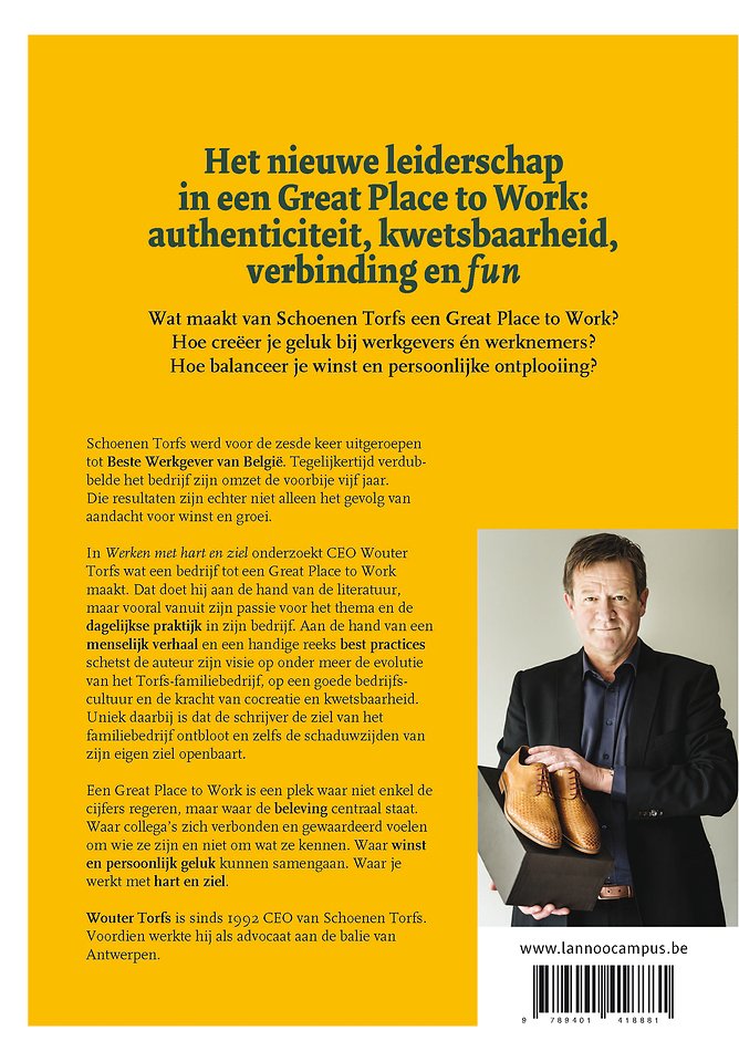 In ‘Werken met hart en ziel’ onderzoekt CEO Wouter Torfs wat een bedrijf tot een Great Place to Work maakt. Dat doet hij aan de hand van de literatuur, maar vooral vanuit zijn passie voor het thema en de dagelijkse praktijk in zijn bedrijf. Aan de hand van een menselijk verhaal en een handige reeks best practices schetst de auteur zijn visie op onder meer de evolutie van het Torfs-familiebedrijf, op een goede bedrijfscultuur en de kracht van cocreatie en kwetsbaarheid. Uniek daarbij is dat de schrijver de ziel van het familiebedrijf ontbloot en zelfs de schaduwzijden van zijn eigen ziel openbaart.