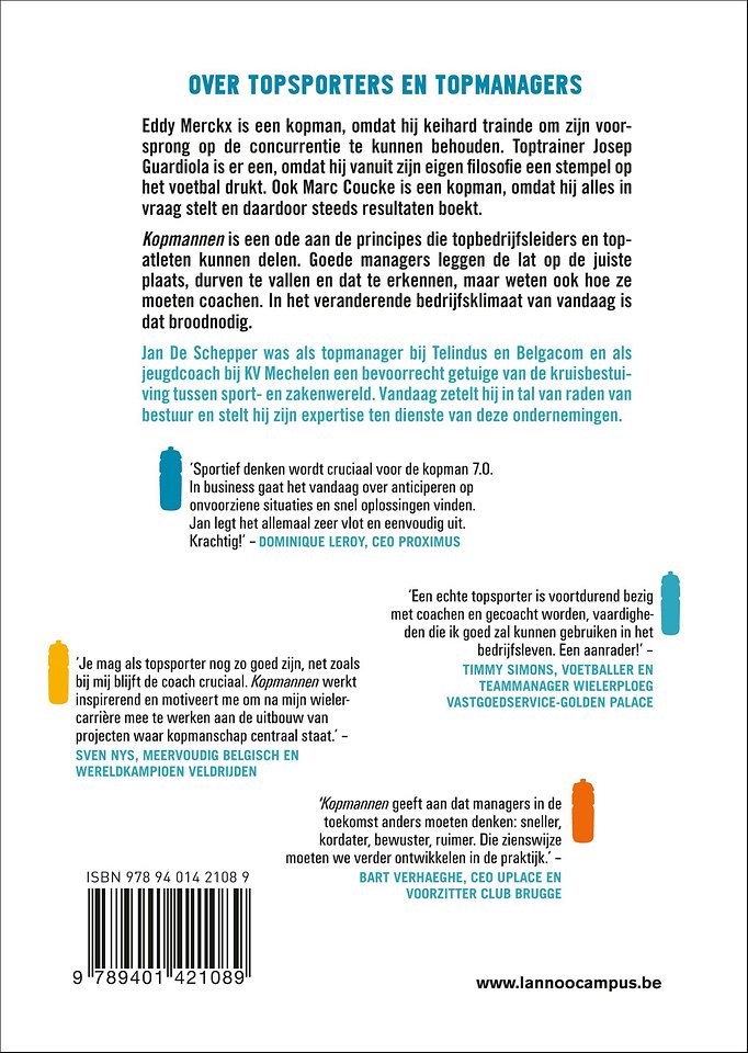 Meer over Jan De SchepperEddy Merckx is een kopman, omdat hij keihard trainde om zijn voorsprong op de concurrentie te kunnen behouden. Toptrainer Josep Guardiola is er een, omdat hij vanuit zijn eigen filosofie een stempel op het voetbal drukt. Ook Marc Coucke is een kopman, omdat hij alles in vraag stelt en daardoor steeds resultaten boekt.