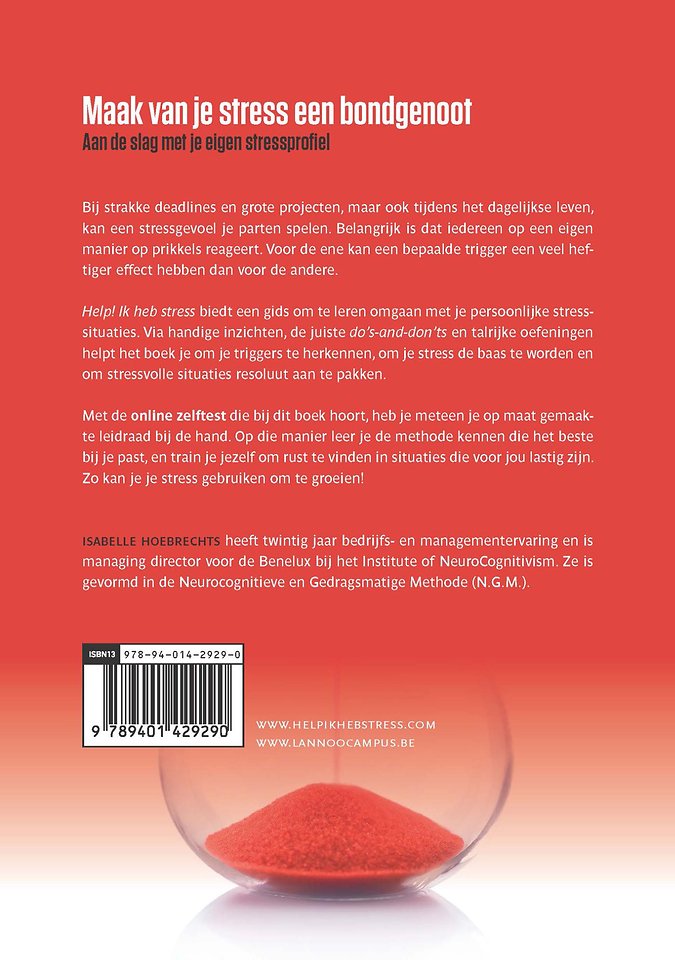Help! Ik heb stress biedt een gids om te leren omgaan met je persoonlijke stresssituaties. Via handige inzichten, de juiste do's-and-don'ts en talrijke oefeningen helpt het boek je om je triggers te herkennen, om je stress de baas te worden en om stressvolle situaties resoluut aan te pakken.