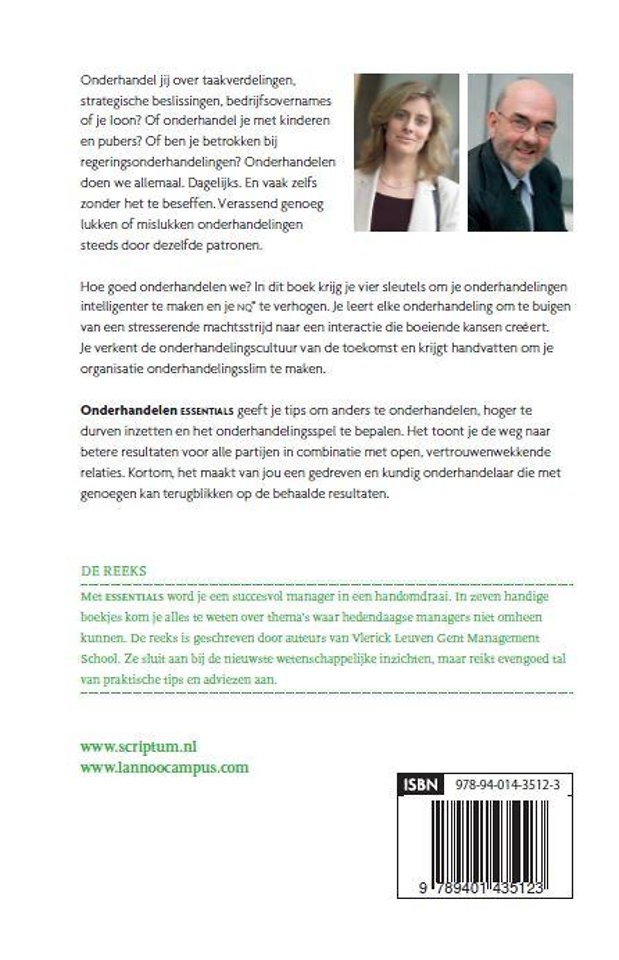 In dit boek krijg je vier sleutels om je onderhandelingen intelligenter te maken en je nq® te verhogen. Je leert elke onderhandeling om te buigen van een stresserende machtsstrijd naar een interactie die boeiende kansen creëert. Je verkent de onderhandelingscultuur van de toekomst en krijgt handvatten om je organisatie onderhandelingsslim te maken. ESSENTIALS Onderhandelen geeft je tips om anders te onderhandelen, hoger te durven inzetten en het onderhandelingsspel te bepalen. Het toont je de weg naar betere resultaten voor alle partijen in combinatie met open, vertrouwenwekkende relaties.